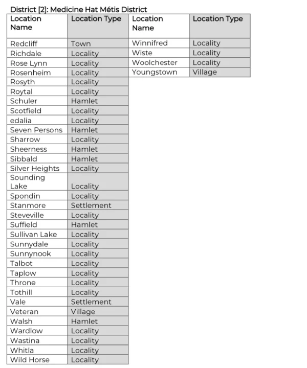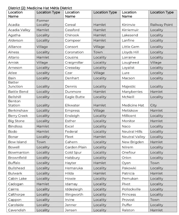 Under the Otipemisiwak Métis Government Constitution, the five Territories of the Métis Nation within Alberta are subdivided into Districts to allow for more effective and localized representation. Medicine Hat Métis District is in District 2.